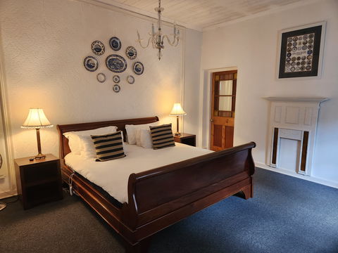 The original homestead’s main bedroom, this beautiful blue room has a his and hers bathroom, a change room and a spacious lounge with private sit out area looking over the Moonlight garden and up onto the face of the mountain.
